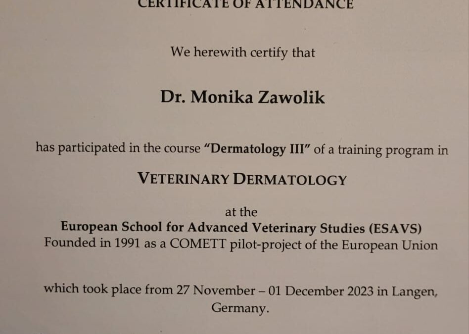 W grudniu lek.wet. Monika Zawolik wzięła udział w trzeciej części europejskiego kursu dermatologii weterynaryjnej ESAVS