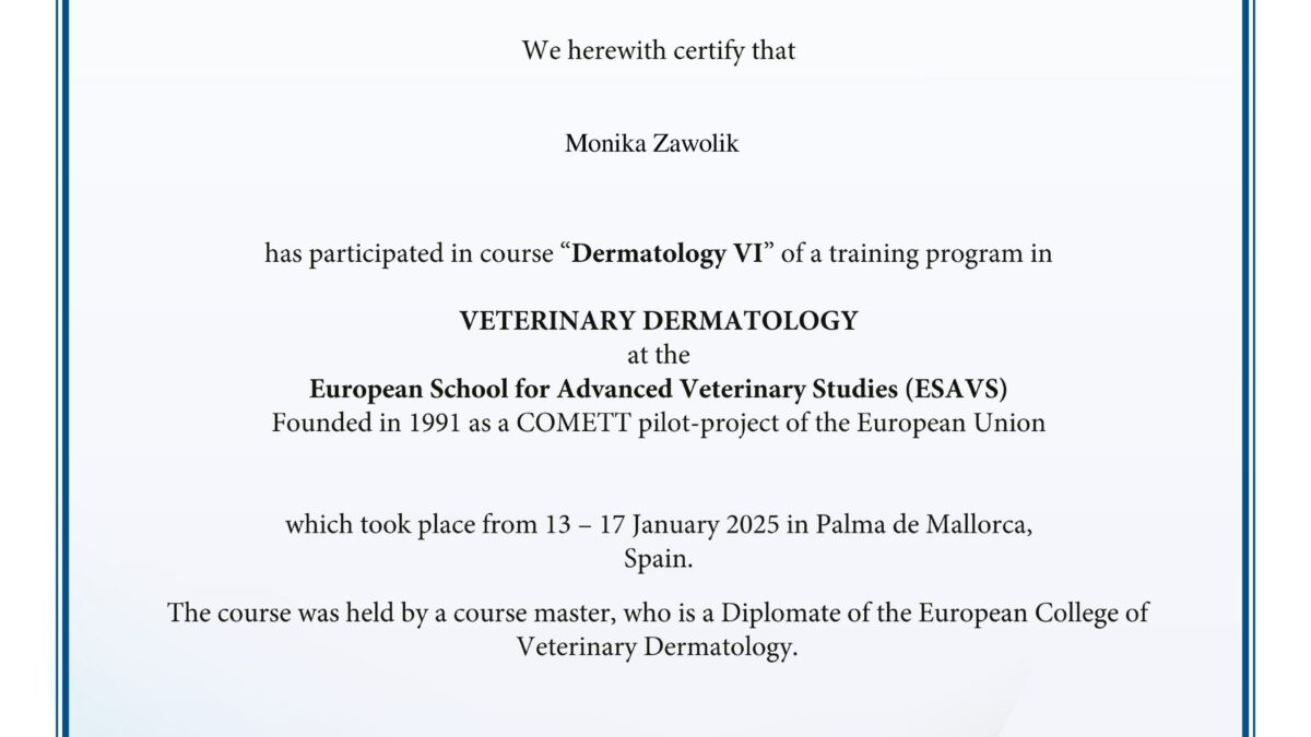W styczniu 2025 roku lek. wet. Monika Zawolik uczestniczyła w ostatniej już VI części Europejskiego Kursu ESAVS z Dermatologii, tematem szkolenia była szeroko pojętą otologia psów, kotów i choroby skóry zwierząt egzotycznych.