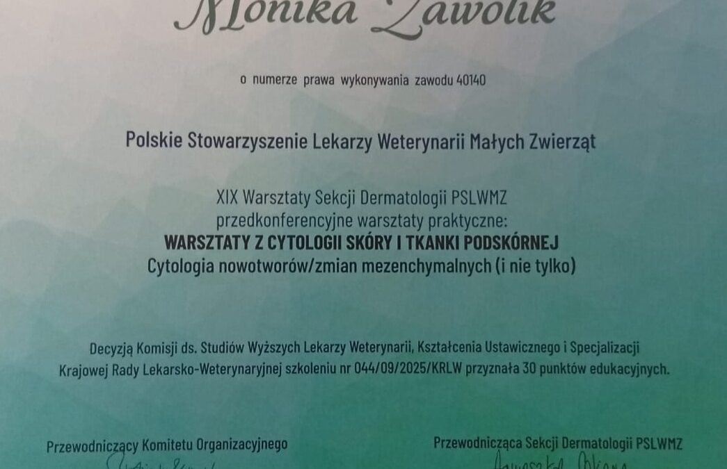 Jak co roku w marcu lek. wet. Monika Zawolik wzięła udział w warsztatach cytologicznych i dermatologicznych prowadzonych przez dyplomowanych specjalistów europejskich w przepięknym Ustroniu.