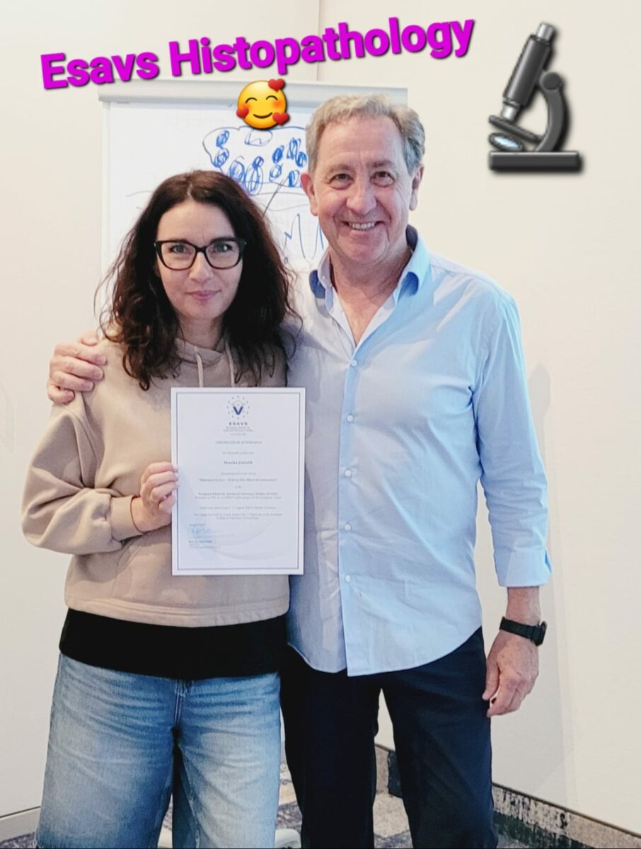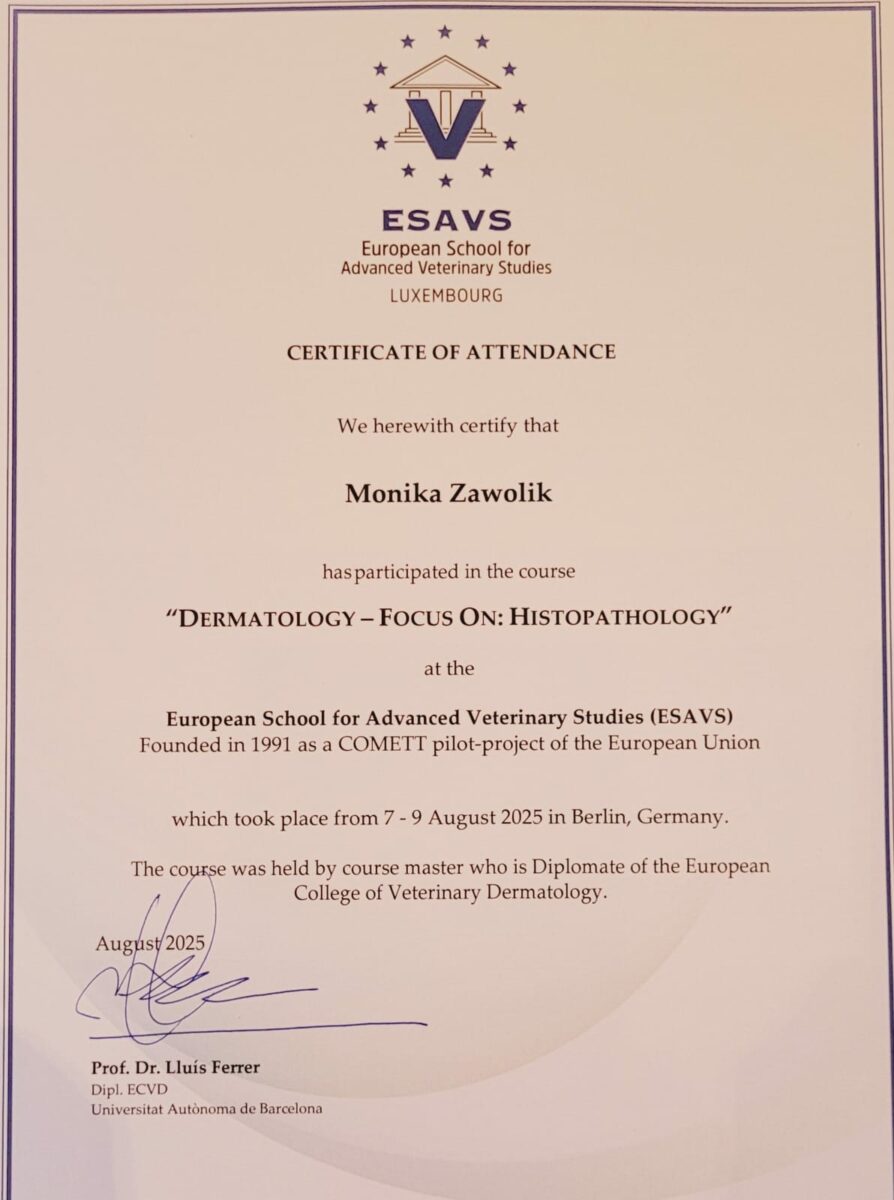 W sierpniu 2025 roku lek. wet. Monika Zawolik odbyła w Berlinie kurs histopatologii dermatologicznej w ramach swoich europejskich studiów ESAVS, to bardzo ważne, żeby rozumieć patomechanizm powstawania zmian skórnych . Jest to pomocne w doborze odpowiedniego leczenia
